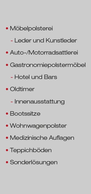 Unsere Stoffe und Lederwaren kaufen wir nur von ausgesuchten Zulieferen, mit denen wir schon jahrelang zusammen arbeiten. Dadurch können wir Ihnen eine gleichbleibende und gute Qualität